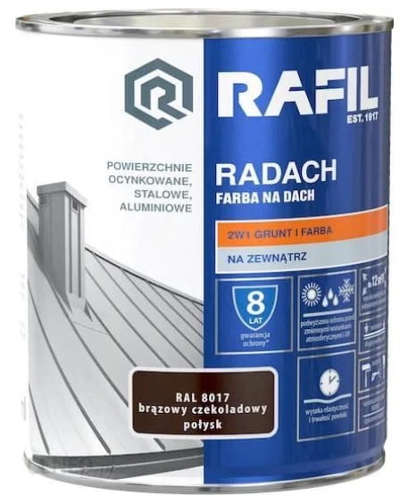 Wysokiej jakości gruntoemalia RADACH FARBA NA DACH przeznaczona jest do ochronno-dekoracyjnego malowania zewnętrznych powierzchni metalowych: stalowych, ocynkowanych i aluminiowych. Farba stosowana jest zarówno do wykonywania nowych wymalowań, jak i renowacji starych powłok malarskich. Charakteryzuje się doskonałą przyczepnością do podłoża. Tworzy szybkoschnące, wysoce elastyczne powłoki o podwyższonej odporności na działanie światła słonecznego, wody i innych czynników atmosferycznych. RADACH FARBA NA DACH zapewnia długotrwały efekt dekoracyjny malowanych powierzchni, a w zestawieniu z Rafil PODKŁAD ANTYKOROZYJNY stanowi silne zabezpieczenie przed korozją.