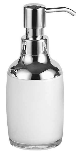 Dozownik na mydło w kolorze białym ze srebrnym wykończeniem.