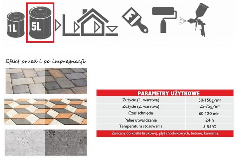 Przeznaczony do impregnacji mineralnych i porowatych podłoży budowlanych. Zalecany do kostki brukowej, płyt chodnikowych i elewacyjnych, krawężników, betonu i prefabrykatów budowlanych, kamienia naturalnego.