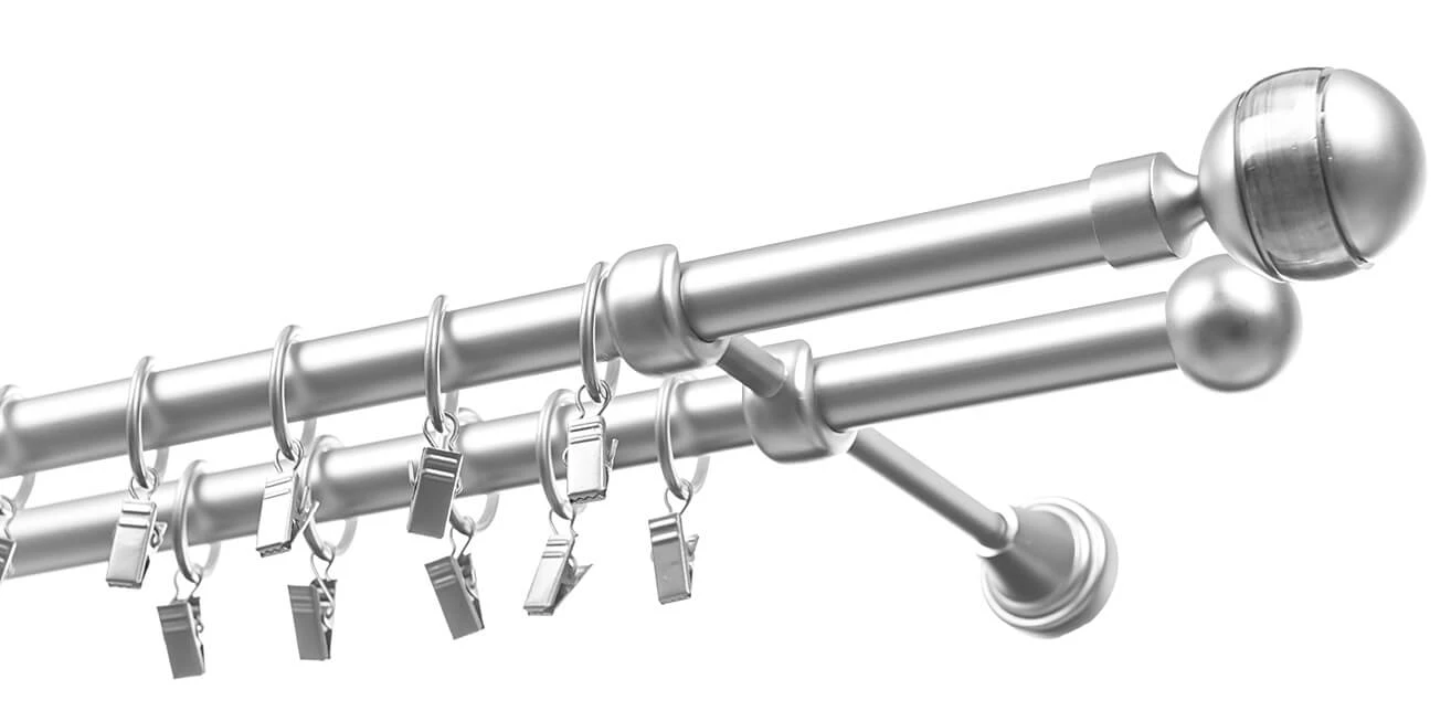 Podwójny karnisz metalowy w wykończeniu chrom mat (satyna) z ozdobnym zakończeniem Kula Olimp to eleganckie połączenie klasycznej formy z nowoczesną kolorystyką. Satynowa powłoka nadaje wnętrzu stonowany, profesjonalny wygląd, idealnie pasując do nowoczesnych okuć, oświetlenia oraz mebli w stylu skandynawskim czy minimalistycznym.