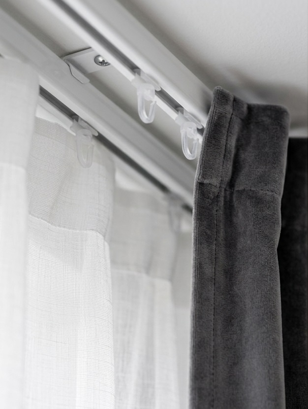 Dwuetapowa dekoracja: Podwójny tor jezdny umożliwia swobodne przesuwanie dwóch warstw tkanin niezależnie od siebie, co ułatwia regulację poziomu nasłonecznienia w pomieszczeniu.