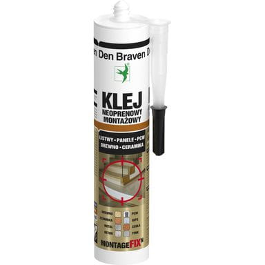 Klej montażowy neoprenowy - MONTAGEFIX-N to jednoskładnikowy klej na bazie kauczuku neoprenowego do zastosowań zewnętrznych i wewnętrznych np.: do klejenia elementów wykończeniowych z drewna i drewnopochodnych, PCW, ceramiki, gipsu, betonu, kamienia, stali.