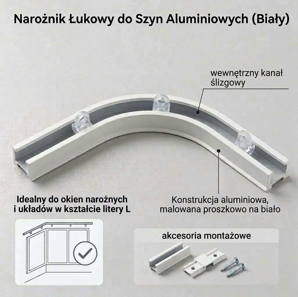 Aluminiowy łuk o kącie 90 stopni to niezbędny element systemu szynowego, który pozwala na płynne i estetyczne prowadzenie zasłon w narożnikach pomieszczeń. Dzięki precyzyjnemu wyprofilowaniu, element ten umożliwia zasłonięcie bocznych ścian przy oknie lub stworzenie efektownej, zaokrąglonej dekoracji okiennej, która idealnie dopasowuje się do architektury wnętrza.