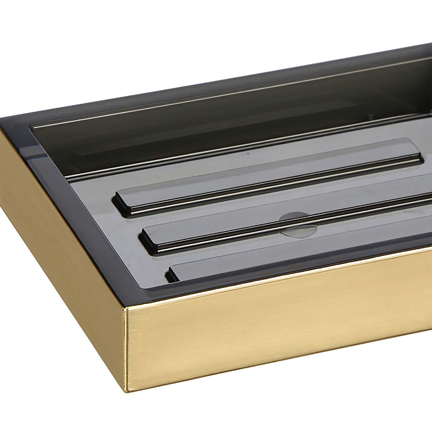 Szczotkowane złoto - powierzchnia mydelniczki została wymodelowana na wzór szczotkowanej stali w kolorze głębokiego złota. Takie wykończenie nadaje jej nowoczesnej surowości połączonej z klasyczną elegancją, a jednocześnie sprawia, że odciski palców czy zacieki są na niej mniej widoczne.
