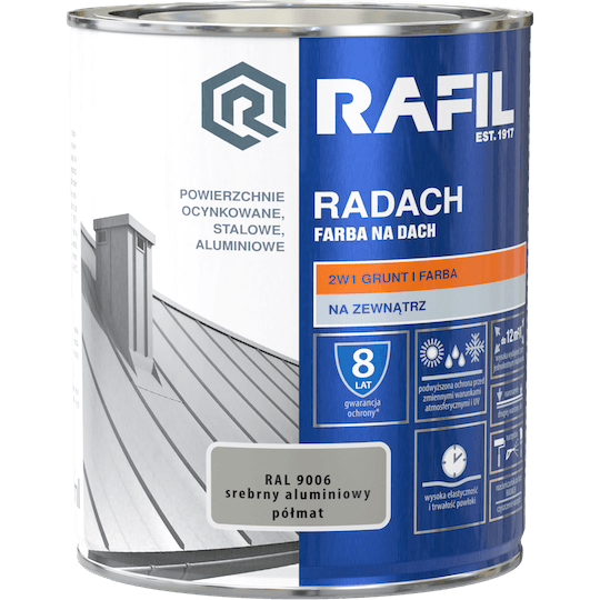 Wysokiej jakości gruntoemalia RADACH FARBA NA DACH przeznaczona jest do ochronno-dekoracyjnego malowania zewnętrznych powierzchni metalowych: stalowych, ocynkowanych i aluminiowych. Farba stosowana jest zarówno do wykonywania nowych wymalowań, jak i renowacji starych powłok malarskich. Charakteryzuje się doskonałą przyczepnością do podłoża. Tworzy szybkoschnące, wysoce elastyczne powłoki o podwyższonej odporności na działanie światła słonecznego, wody i innych czynników atmosferycznych. RADACH FARBA NA DACH zapewnia długotrwały efekt dekoracyjny malowanych powierzchni, a w zestawieniu z Rafil PODKŁAD ANTYKOROZYJNY stanowi silne zabezpieczenie przed korozją.