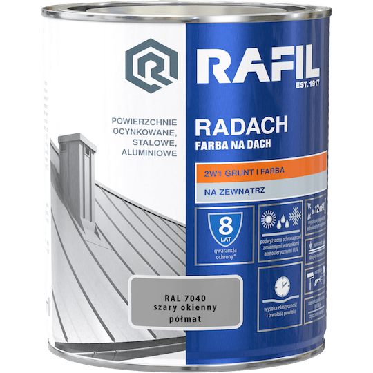 Wysokiej jakości gruntoemalia RADACH FARBA NA DACH przeznaczona jest do ochronno-dekoracyjnego malowania zewnętrznych powierzchni metalowych: stalowych, ocynkowanych i aluminiowych. Farba stosowana jest zarówno do wykonywania nowych wymalowań, jak i renowacji starych powłok malarskich. Charakteryzuje się doskonałą przyczepnością do podłoża. Tworzy szybkoschnące, wysoce elastyczne powłoki o podwyższonej odporności na działanie światła słonecznego, wody i innych czynników atmosferycznych. RADACH FARBA NA DACH zapewnia długotrwały efekt dekoracyjny malowanych powierzchni, a w zestawieniu z Rafil PODKŁAD ANTYKOROZYJNY stanowi silne zabezpieczenie przed korozją.