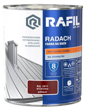 Wysokiej jakości gruntoemalia RADACH FARBA NA DACH przeznaczona jest do ochronno-dekoracyjnego malowania zewnętrznych powierzchni metalowych: stalowych, ocynkowanych i aluminiowych. Farba stosowana jest zarówno do wykonywania nowych wymalowań, jak i renowacji starych powłok malarskich. Charakteryzuje się doskonałą przyczepnością do podłoża. Tworzy szybkoschnące, wysoce elastyczne powłoki o podwyższonej odporności na działanie światła słonecznego, wody i innych czynników atmosferycznych. RADACH FARBA NA DACH zapewnia długotrwały efekt dekoracyjny malowanych powierzchni, a w zestawieniu z Rafil PODKŁAD ANTYKOROZYJNY stanowi silne zabezpieczenie przed korozją.