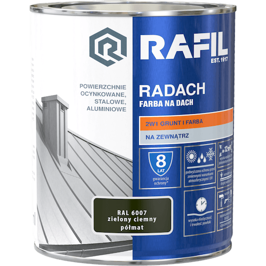 Wysokiej jakości gruntoemalia RADACH FARBA NA DACH przeznaczona jest do ochronno-dekoracyjnego malowania zewnętrznych powierzchni metalowych: stalowych, ocynkowanych i aluminiowych. Farba stosowana jest zarówno do wykonywania nowych wymalowań, jak i renowacji starych powłok malarskich. Charakteryzuje się doskonałą przyczepnością do podłoża. Tworzy szybkoschnące, wysoce elastyczne powłoki o podwyższonej odporności na działanie światła słonecznego, wody i innych czynników atmosferycznych. RADACH FARBA NA DACH zapewnia długotrwały efekt dekoracyjny malowanych powierzchni, a w zestawieniu z Rafil PODKŁAD ANTYKOROZYJNY stanowi silne zabezpieczenie przed korozją.