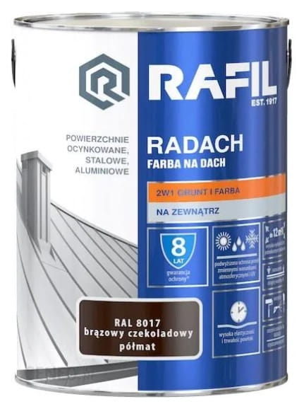 Wysokiej jakości gruntoemalia RADACH FARBA NA DACH przeznaczona jest do ochronno-dekoracyjnego malowania zewnętrznych powierzchni metalowych: stalowych, ocynkowanych i aluminiowych. Farba stosowana jest zarówno do wykonywania nowych wymalowań, jak i renowacji starych powłok malarskich. Charakteryzuje się doskonałą przyczepnością do podłoża. Tworzy szybkoschnące, wysoce elastyczne powłoki o podwyższonej odporności na działanie światła słonecznego, wody i innych czynników atmosferycznych. RADACH FARBA NA DACH zapewnia długotrwały efekt dekoracyjny malowanych powierzchni, a w zestawieniu z Rafil PODKŁAD ANTYKOROZYJNY stanowi silne zabezpieczenie przed korozją.