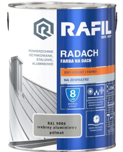 Wysokiej jakości gruntoemalia RADACH FARBA NA DACH przeznaczona jest do ochronno-dekoracyjnego malowania zewnętrznych powierzchni metalowych: stalowych, ocynkowanych i aluminiowych. Farba stosowana jest zarówno do wykonywania nowych wymalowań, jak i renowacji starych powłok malarskich. Charakteryzuje się doskonałą przyczepnością do podłoża. Tworzy szybkoschnące, wysoce elastyczne powłoki o podwyższonej odporności na działanie światła słonecznego, wody i innych czynników atmosferycznych. RADACH FARBA NA DACH zapewnia długotrwały efekt dekoracyjny malowanych powierzchni, a w zestawieniu z Rafil PODKŁAD ANTYKOROZYJNY stanowi silne zabezpieczenie przed korozją.