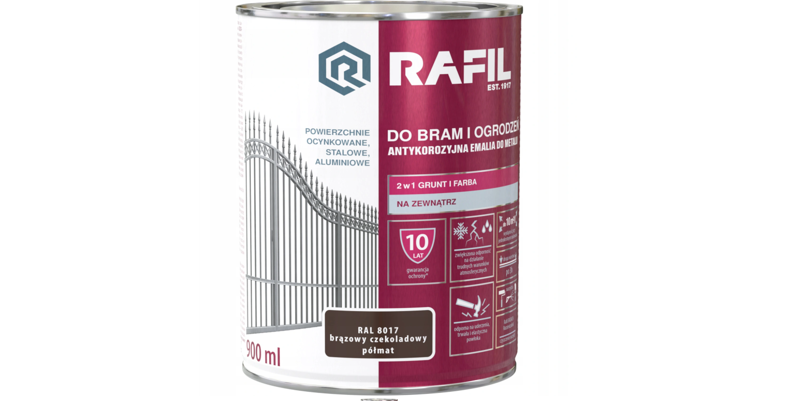 Antykorozyjna Emalia RAFIL DO BRAM I OGRODZEŃ przeznaczona jest do ochronno-dekoracyjnego malowania powierzchni metalowych: stalowych, ocynkowanych i aluminiowych eksploatowanych na zewnątrz pomieszczeń. Tworzy trwałą i elastyczną powłokę odporną na uderzenia. Charakteryzuje się zwiększoną odpornością na działanie trudnych warunków atmosferycznych. Zapewnia długotrwały efekt dekoracyjny malowanych powierzchni, a w zestawieniu z Rafil PODKŁAD ANTYKOROZYJNY stanowi silne zabezpieczenie przed korozją