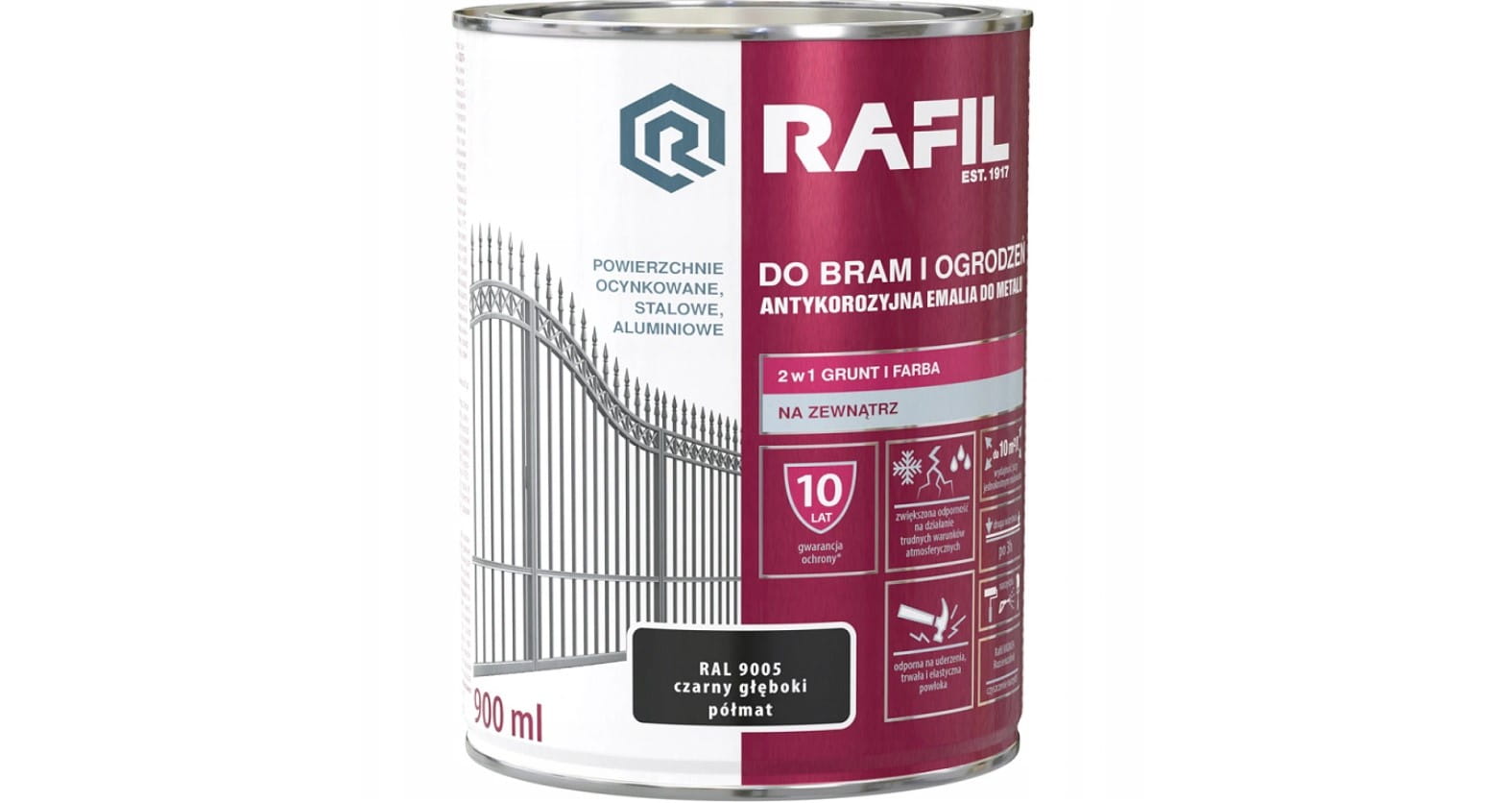Antykorozyjna Emalia RAFIL DO BRAM I OGRODZEŃ przeznaczona jest do ochronno-dekoracyjnego malowania powierzchni metalowych: stalowych, ocynkowanych i aluminiowych eksploatowanych na zewnątrz pomieszczeń. Tworzy trwałą i elastyczną powłokę odporną na uderzenia. Charakteryzuje się zwiększoną odpornością na działanie trudnych warunków atmosferycznych. Zapewnia długotrwały efekt dekoracyjny malowanych powierzchni, a w zestawieniu z Rafil PODKŁAD ANTYKOROZYJNY stanowi silne zabezpieczenie przed korozją