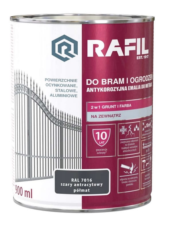 Antykorozyjna Emalia RAFIL DO BRAM I OGRODZEŃ przeznaczona jest do ochronno-dekoracyjnego malowania powierzchni metalowych: stalowych, ocynkowanych i aluminiowych eksploatowanych na zewnątrz pomieszczeń. Tworzy trwałą i elastyczną powłokę odporną na uderzenia. Charakteryzuje się zwiększoną odpornością na działanie trudnych warunków atmosferycznych. Zapewnia długotrwały efekt dekoracyjny malowanych powierzchni, a w zestawieniu z Rafil PODKŁAD ANTYKOROZYJNY stanowi silne zabezpieczenie przed korozją
