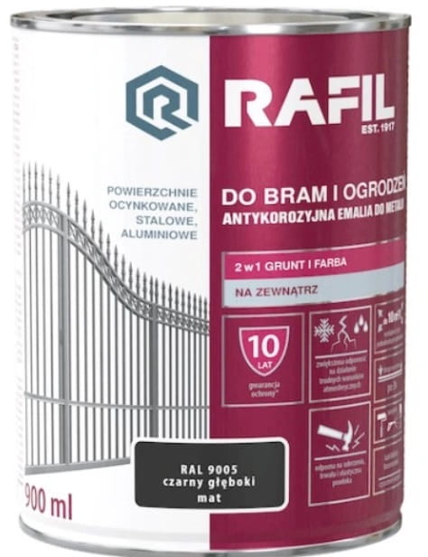 Antykorozyjna Emalia RAFIL DO BRAM I OGRODZEŃ przeznaczona jest do ochronno-dekoracyjnego malowania powierzchni metalowych: stalowych, ocynkowanych i aluminiowych eksploatowanych na zewnątrz pomieszczeń. Tworzy trwałą i elastyczną powłokę odporną na uderzenia. Charakteryzuje się zwiększoną odpornością na działanie trudnych warunków atmosferycznych. Zapewnia długotrwały efekt dekoracyjny malowanych powierzchni, a w zestawieniu z Rafil PODKŁAD ANTYKOROZYJNY stanowi silne zabezpieczenie przed korozją