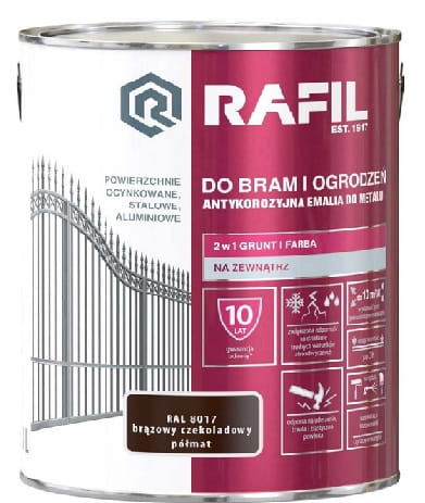 Antykorozyjna Emalia RAFIL DO BRAM I OGRODZEŃ przeznaczona jest do ochronno-dekoracyjnego malowania powierzchni metalowych: stalowych, ocynkowanych i aluminiowych eksploatowanych na zewnątrz pomieszczeń. Tworzy trwałą i elastyczną powłokę odporną na uderzenia. Charakteryzuje się zwiększoną odpornością na działanie trudnych warunków atmosferycznych. Zapewnia długotrwały efekt dekoracyjny malowanych powierzchni, a w zestawieniu z Rafil PODKŁAD ANTYKOROZYJNY stanowi silne zabezpieczenie przed korozją