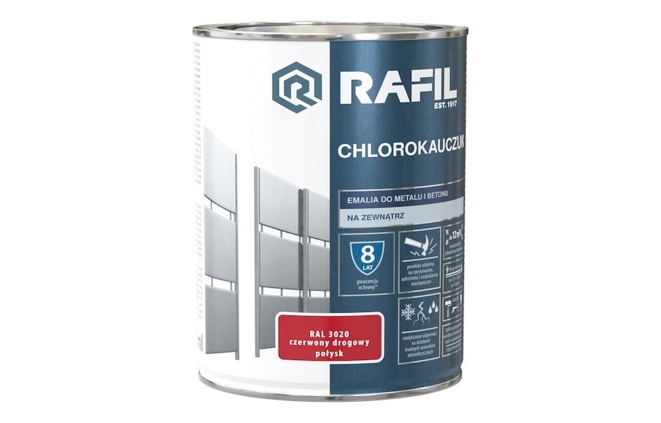 Emalia Rafil CHLOROKAUCZUK przeznaczona jest do ochronno-dekoracyjnego malowania powierzchni stalowych, żeliwnych i betonowych eksploatowanych na zewnątrz pomieszczeń. Tworzy trwałą i elastyczną powłokę, odporną na zarysowania, uderzenia i uszkodzenia mechaniczne. Charakteryzuje się zwiększoną odpornością na działanie trudnych warunków atmosferycznych. Zapewnia długotrwałą ochronę antykorozyjną malowanych powierzchni metalowych w zestawieniu z Rafil PODKŁAD CHLOROKAUCZUKOWY. Podłoża betonowe nie wymagają zastosowania podkładu przed nałożeniem emalii Rafil CHLOROKAUCZUK.