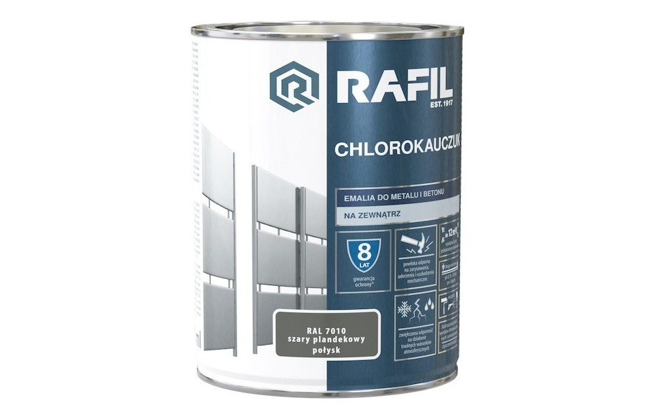 Emalia Rafil CHLOROKAUCZUK przeznaczona jest do ochronno-dekoracyjnego malowania powierzchni stalowych, żeliwnych i betonowych eksploatowanych na zewnątrz pomieszczeń. Tworzy trwałą i elastyczną powłokę, odporną na zarysowania, uderzenia i uszkodzenia mechaniczne. Charakteryzuje się zwiększoną odpornością na działanie trudnych warunków atmosferycznych. Zapewnia długotrwałą ochronę antykorozyjną malowanych powierzchni metalowych w zestawieniu z Rafil PODKŁAD CHLOROKAUCZUKOWY. Podłoża betonowe nie wymagają zastosowania podkładu przed nałożeniem emalii Rafil CHLOROKAUCZUK.