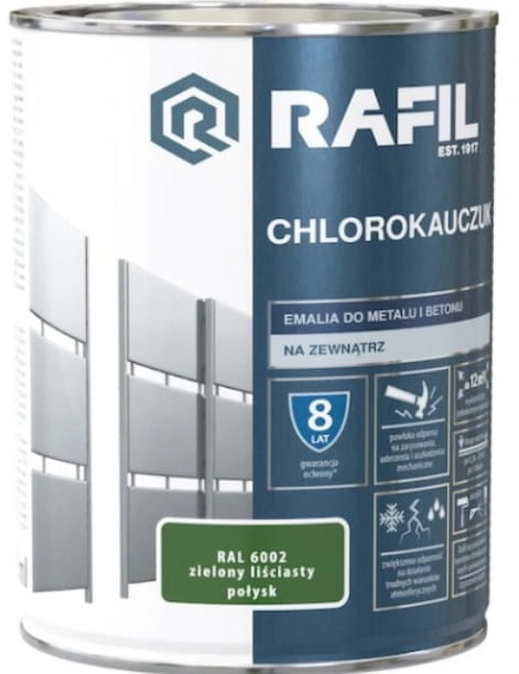 Emalia przeznaczona jest do ochronno-dekoracyjnego malowania powierzchni stalowych, żeliwnych i betonowych eksploatowanych na zewnątrz pomieszczeń. Tworzy trwałą i elastyczną powłokę, odporną na zarysowania, uderzenia i uszkodzenia mechaniczne. Charakteryzuje się zwiększoną odpornością na działanie trudnych warunków atmosferycznych. Zapewnia długotrwałą ochronę antykorozyjną malowanych powierzchni metalowych w zestawieniu z Rafil PODKŁAD CHLOROKAUCZUKOWY. Podłoża betonowe nie wymagają zastosowania podkładu przed nałożeniem emalii Rafil CHLOROKAUCZUK.