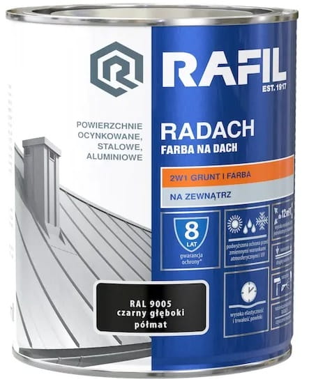 Wysokiej jakości gruntoemalia RADACH FARBA NA DACH przeznaczona jest do ochronno-dekoracyjnego malowania zewnętrznych powierzchni metalowych: stalowych, ocynkowanych i aluminiowych. Farba stosowana jest zarówno do wykonywania nowych wymalowań, jak i renowacji starych powłok malarskich. Charakteryzuje się doskonałą przyczepnością do podłoża. Tworzy szybkoschnące, wysoce elastyczne powłoki o podwyższonej odporności na działanie światła słonecznego, wody i innych czynników atmosferycznych. RADACH FARBA NA DACH zapewnia długotrwały efekt dekoracyjny malowanych powierzchni, a w zestawieniu z Rafil PODKŁAD ANTYKOROZYJNY stanowi silne zabezpieczenie przed korozją.