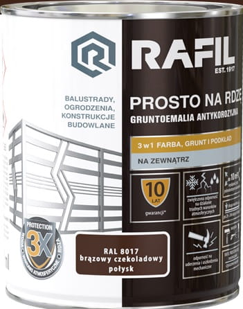 RAFIL PROSTO NA RDZĘ to specjalistyczna gruntoemalia 3w1 stosowana bezpośrednio na powierzchnie stalowe i żeliwne eksploatowane na zewnątrz. Ta łatwa w aplikacji, szybkoschnąca farba charakteryzuje się doskonałą przyczepnością i dobrym kryciem. Dzięki niezwykle trwałej i elastycznej powłoce doskonale chroni powierzchnie metalowe przed szkodliwymi warunkami atmosferycznymi i przed korozją. Właściwości farby zostały potwierdzone Krajową Oceną Techniczną.
