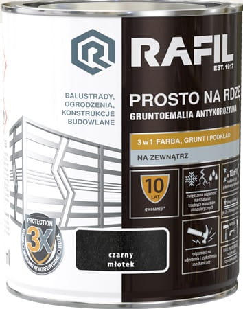 RAFIL PROSTO NA RDZĘ to specjalistyczna gruntoemalia 3w1 stosowana bezpośrednio na powierzchnie stalowe i żeliwne eksploatowane na zewnątrz. Ta łatwa w aplikacji, szybkoschnąca farba charakteryzuje się doskonałą przyczepnością i dobrym kryciem. Dzięki niezwykle trwałej i elastycznej powłoce doskonale chroni powierzchnie metalowe przed szkodliwymi warunkami atmosferycznymi i przed korozją. Właściwości farby zostały potwierdzone Krajową Oceną Techniczną.