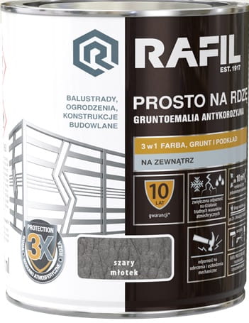 RAFIL PROSTO NA RDZĘ to specjalistyczna gruntoemalia 3w1 stosowana bezpośrednio na powierzchnie stalowe i żeliwne eksploatowane na zewnątrz. Ta łatwa w aplikacji, szybkoschnąca farba charakteryzuje się doskonałą przyczepnością i dobrym kryciem. Dzięki niezwykle trwałej i elastycznej powłoce doskonale chroni powierzchnie metalowe przed szkodliwymi warunkami atmosferycznymi i przed korozją. Właściwości farby zostały potwierdzone Krajową Oceną Techniczną.