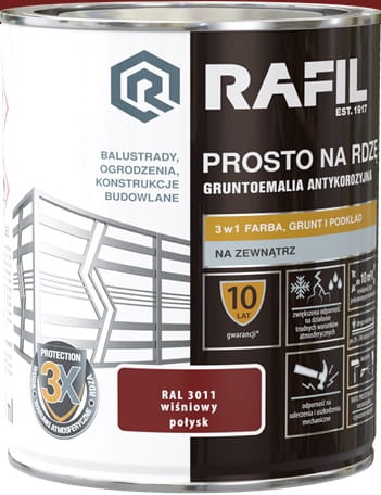 RAFIL PROSTO NA RDZĘ to specjalistyczna gruntoemalia 3w1 stosowana bezpośrednio na powierzchnie stalowe i żeliwne eksploatowane na zewnątrz. Ta łatwa w aplikacji, szybkoschnąca farba charakteryzuje się doskonałą przyczepnością i dobrym kryciem. Dzięki niezwykle trwałej i elastycznej powłoce doskonale chroni powierzchnie metalowe przed szkodliwymi warunkami atmosferycznymi i przed korozją. Właściwości farby zostały potwierdzone Krajową Oceną Techniczną.