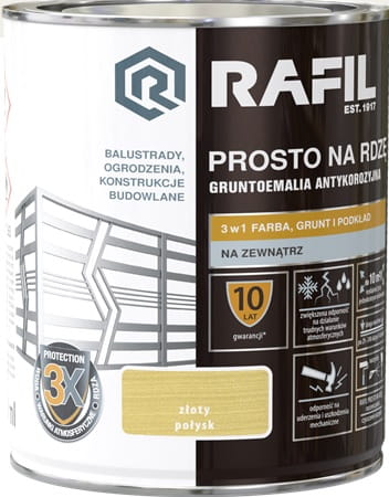 RAFIL PROSTO NA RDZĘ to specjalistyczna gruntoemalia 3w1 stosowana bezpośrednio na powierzchnie stalowe i żeliwne eksploatowane na zewnątrz. Ta łatwa w aplikacji, szybkoschnąca farba charakteryzuje się doskonałą przyczepnością i dobrym kryciem. Dzięki niezwykle trwałej i elastycznej powłoce doskonale chroni powierzchnie metalowe przed szkodliwymi warunkami atmosferycznymi i przed korozją. Właściwości farby zostały potwierdzone Krajową Oceną Techniczną.