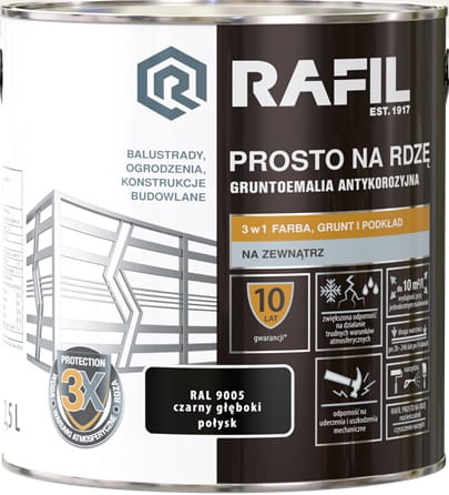 RAFIL PROSTO NA RDZĘ to specjalistyczna gruntoemalia 3w1 stosowana bezpośrednio na powierzchnie stalowe i żeliwne eksploatowane na zewnątrz. Ta łatwa w aplikacji, szybkoschnąca farba charakteryzuje się doskonałą przyczepnością i dobrym kryciem. Dzięki niezwykle trwałej i elastycznej powłoce doskonale chroni powierzchnie metalowe przed szkodliwymi warunkami atmosferycznymi i przed korozją. Właściwości farby zostały potwierdzone Krajową Oceną Techniczną.