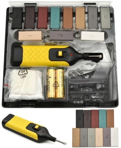 W skład zestawu wchodzi: przyrząd do topienia wypełniaczy, szpachelki, gąbkę polerską oraz zestaw 11 wypełniaczy.